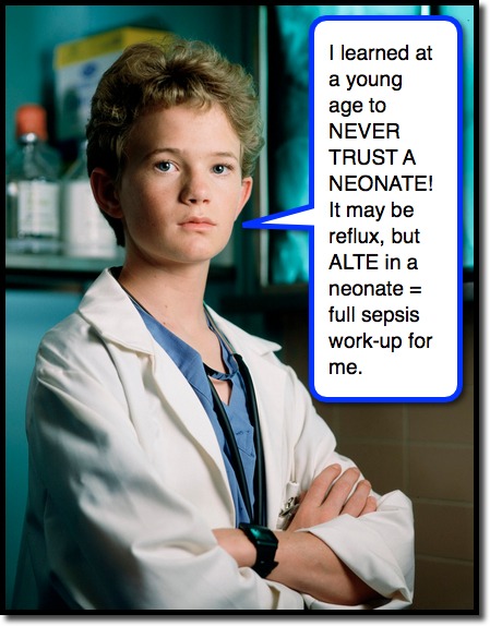One group, however, often requires me to accept my limitations and operate on the more conservative side of caution. The neonate may be super cute, but is also extremely tricky!  We have discussed numerous neonatal topics previously (there is an entire category for them — Hypothermia in a Neonate, Interosseous Access, No Need for Atropine, Neonatal Analgesia, and Necrotizing Enterocolitis to name a few).  We have also discussed ALTE (Apparent Life Threatening Events) previously.  While we have noted that the evaluation of an ALTE is best determined by a thorough history and physical, the neonate warrants a slightly more conservative approach.