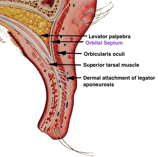 • The orbital septum is the thin membrane that separates the orbit from the outside world.  It isn’t that deep. The upper eyelid skin is the thinnest in the body!