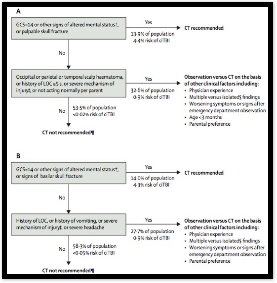 Kuppermann N, et al. Identification of children at very low risk of clinically-important brain injuries after head trauma: a prospective cohort study. Lancet. 2009: Oct 3; 374: 1160-70.